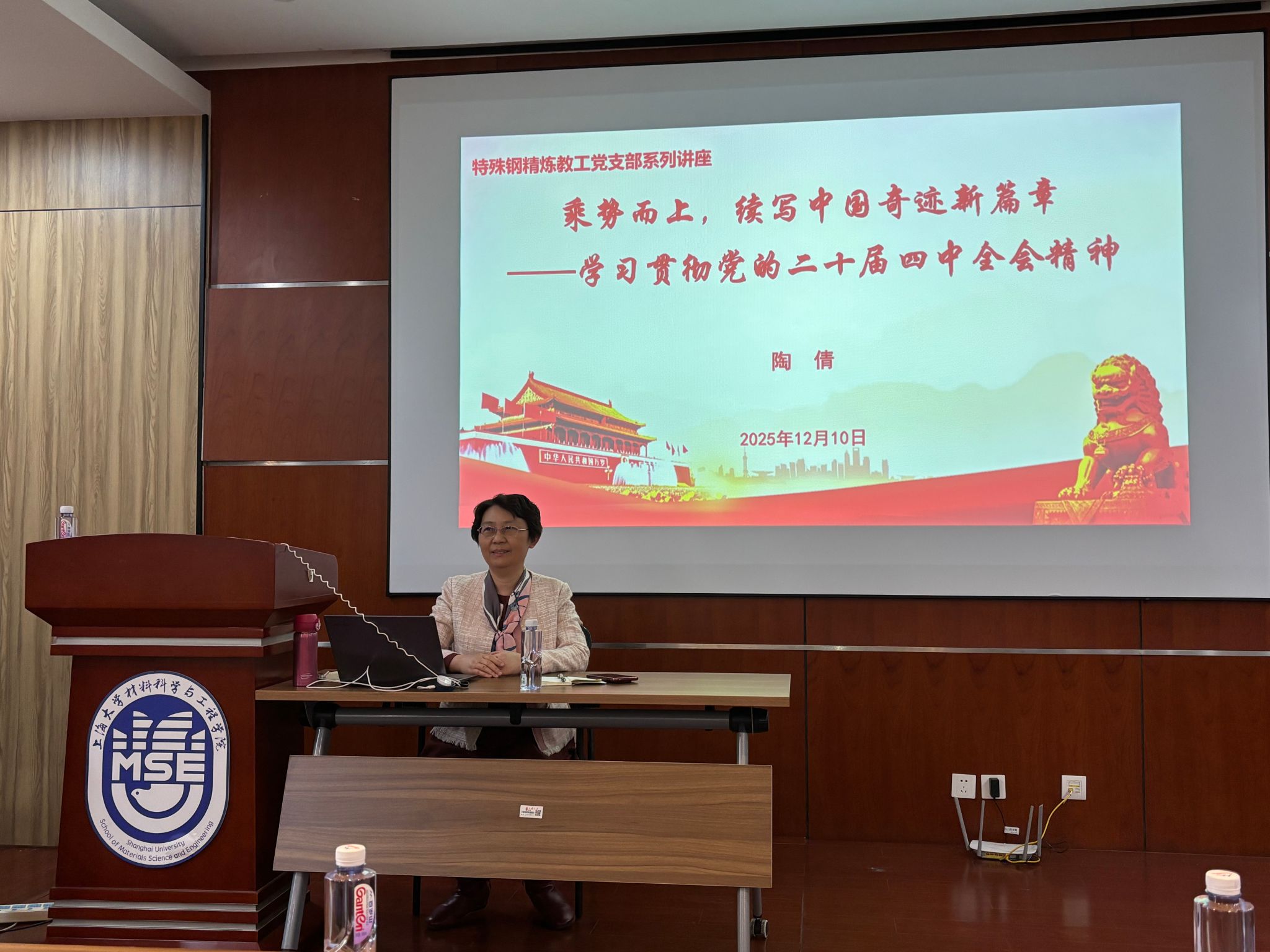 12月10日下午,材料科学与工程学院党委在材料B520报告厅举办“乘势而上,续写中国奇迹新篇章——学习贯彻党的二十届四中全会精神”专题学习会。本次活动由学院党委主办,特殊钢精炼教工党支部具体承办,特邀上海大学学习贯彻党的二十届四中全会精神理论宣讲团专家、国家二级教授、上海大学伟长学者二级教授、博士生导师陶倩作专题辅导报告。学习会由学院党委书记黄健主持,学院中心组成员、各教师党支部书记、特殊钢精炼教工党支部、冶金资源综合利用教工党支部及部分研究生党支部党员参加。